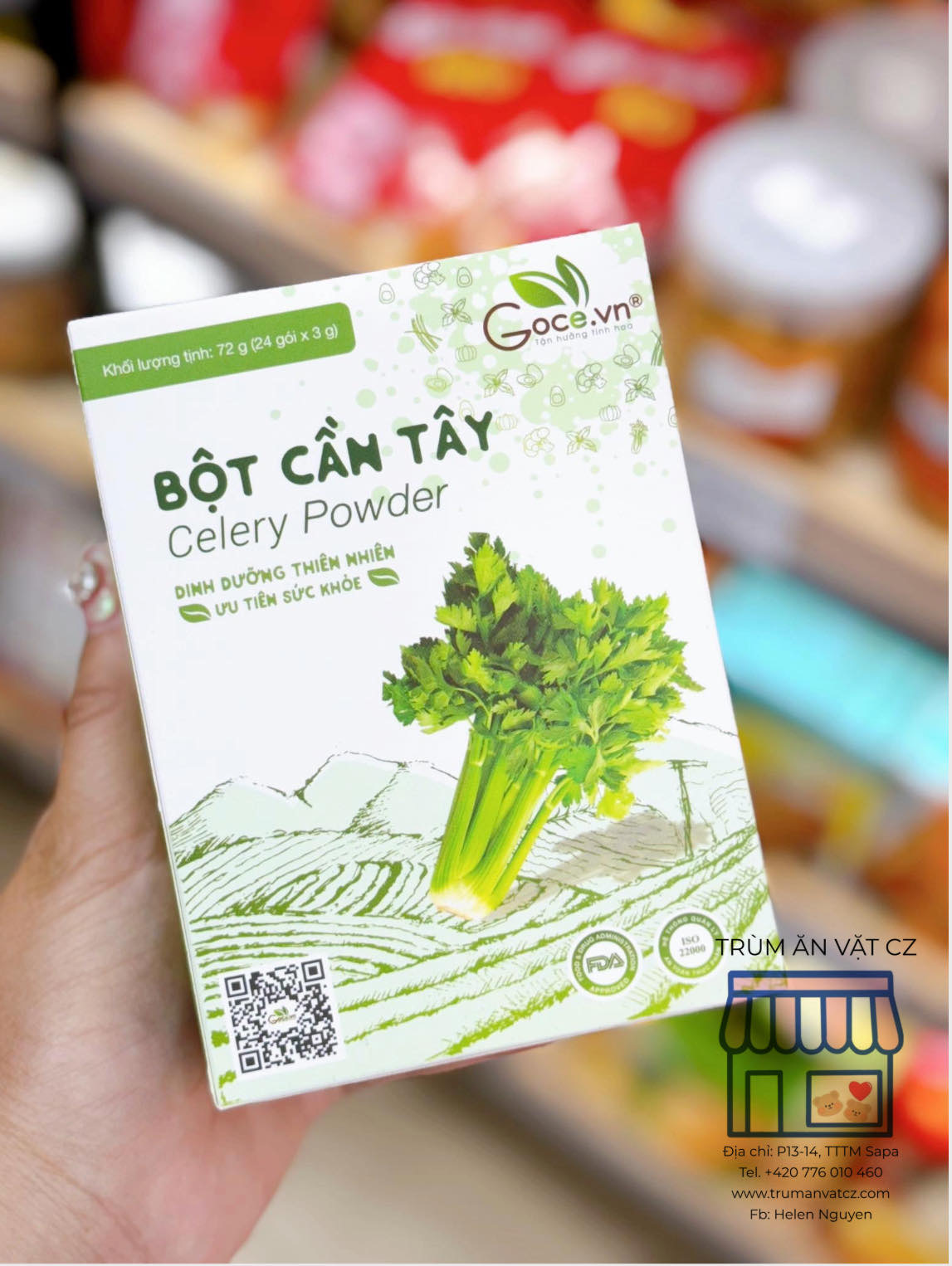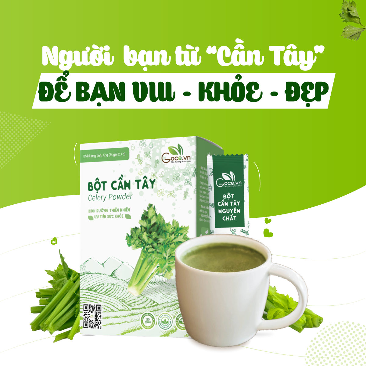 Lưu ý: Bột cần tây GOCE được xay 100% nguyên chất từ rau cần tây nên sẽ có mùi của cần tây ạ, do bột nguyên chất nên sẽ có chất xơ từ rau cần tây dùng rất tốt cho hệ tiêu hóa và không hòa tan được hoàn toàn