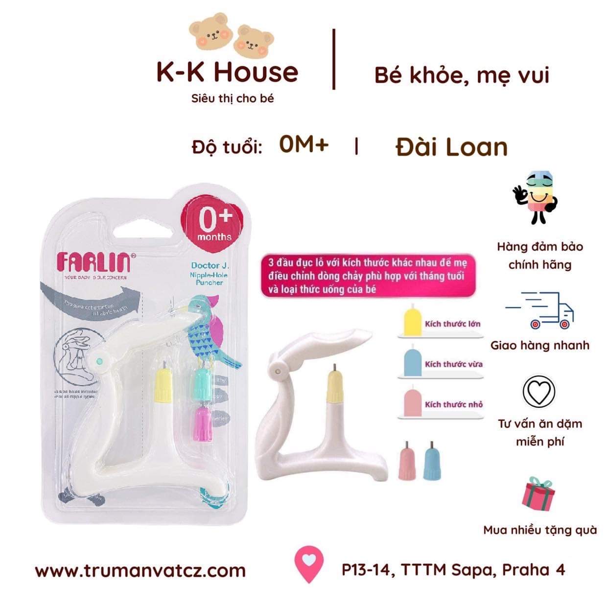 Dụng cụ dập lỗ núm ty Farlin có 3 size đục lỗ để lựa chọn: