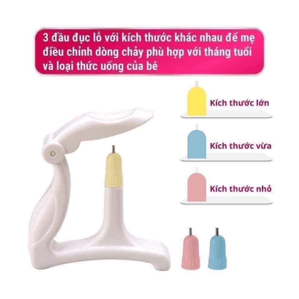 Thiết kế thanh dập với đủ 3 cỡ lớn, vừa và nhỏ , giúp các bà mẹ dễ dàng điều chỉnh dòng chảy của sữa theo nhu cầu bú của bé yêu ; Cán dập lớn và thiết kế nhỏ gọn, tiện lợi và không tốn sức khi sử dụng