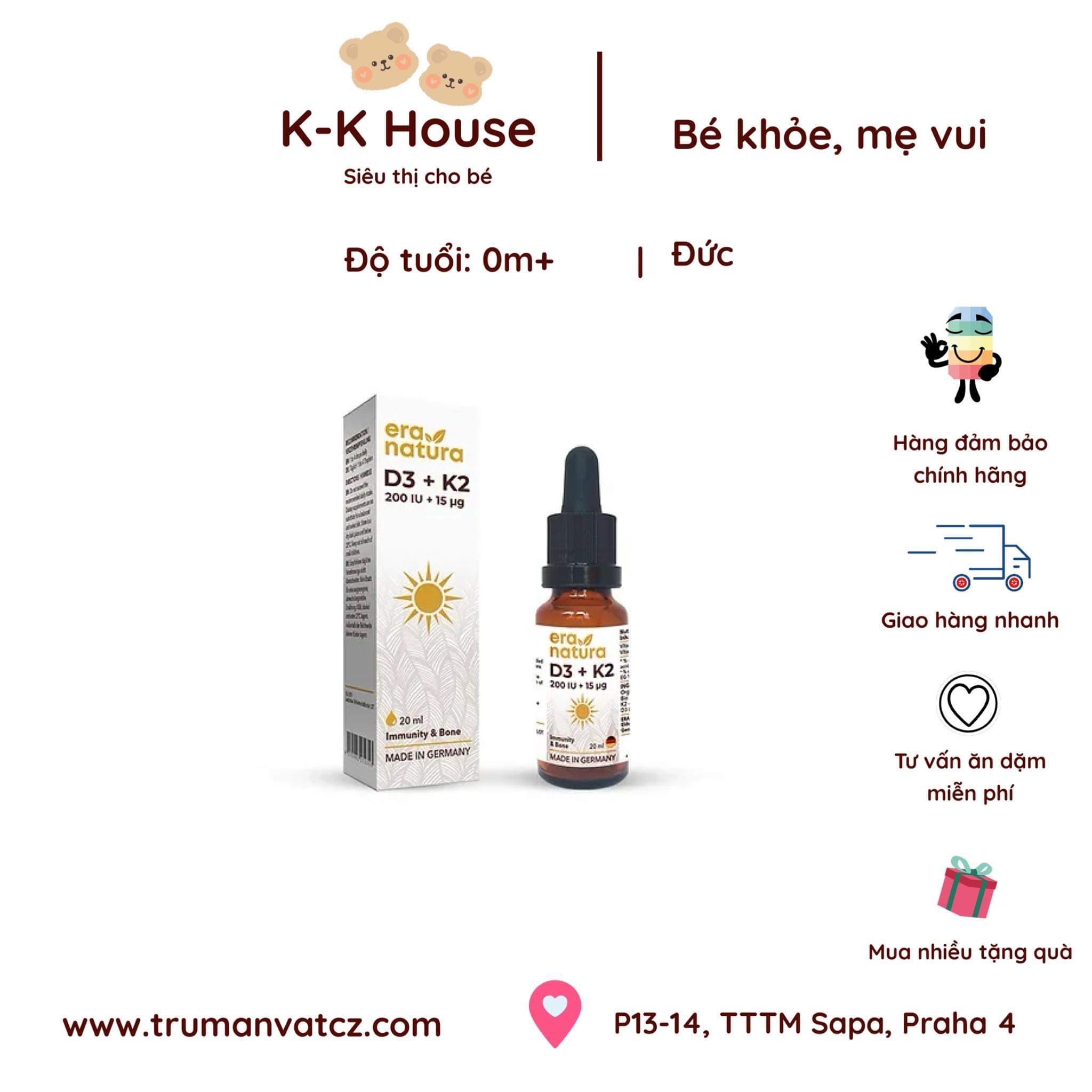 Mô tả: lọ 20ml tương đương 600 giọt (16,8g), có 5µg Vitamin D3 + 15µg K2 MK7